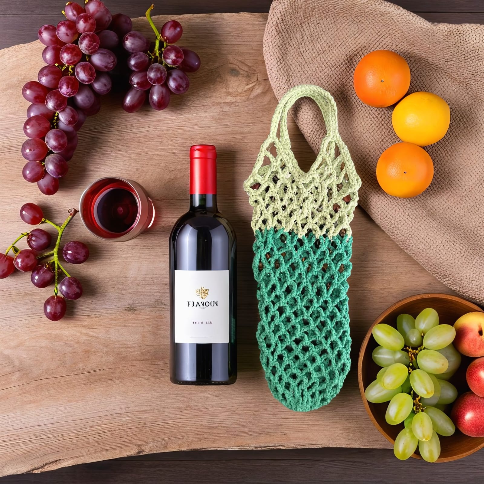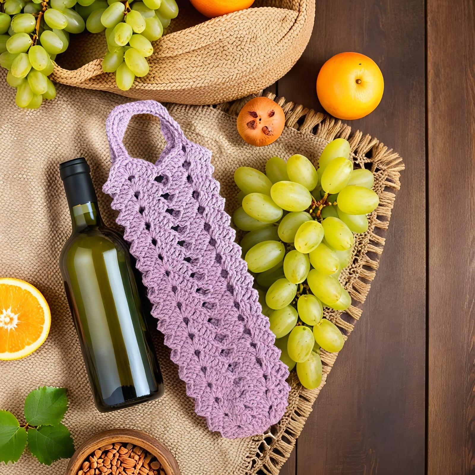 Die gehäkelte Netztasche „Avoska“ ist ein leichter, eleganter und umweltfreundlicher Begleiter aus natürlicher Baumwolle. Ideal zum sicheren und stilvollen Tragen von Öl-, Wein- und Getränkeflaschen. Die flexible Netzstruktur passt sich der Form an und eignet sich perfekt als außergewöhnliche Geschenkverpackung für hochwertige Getränke. Luftiges Design, hohe Tragfähigkeit und in verschiedenen Farben erhältlich.