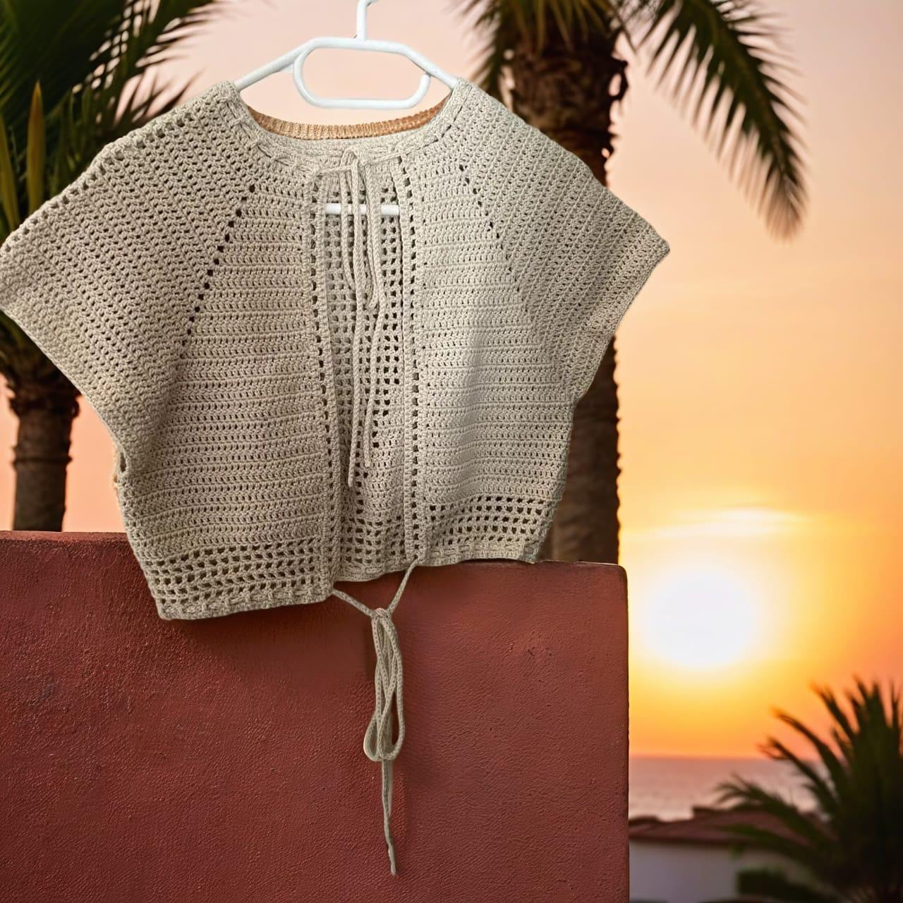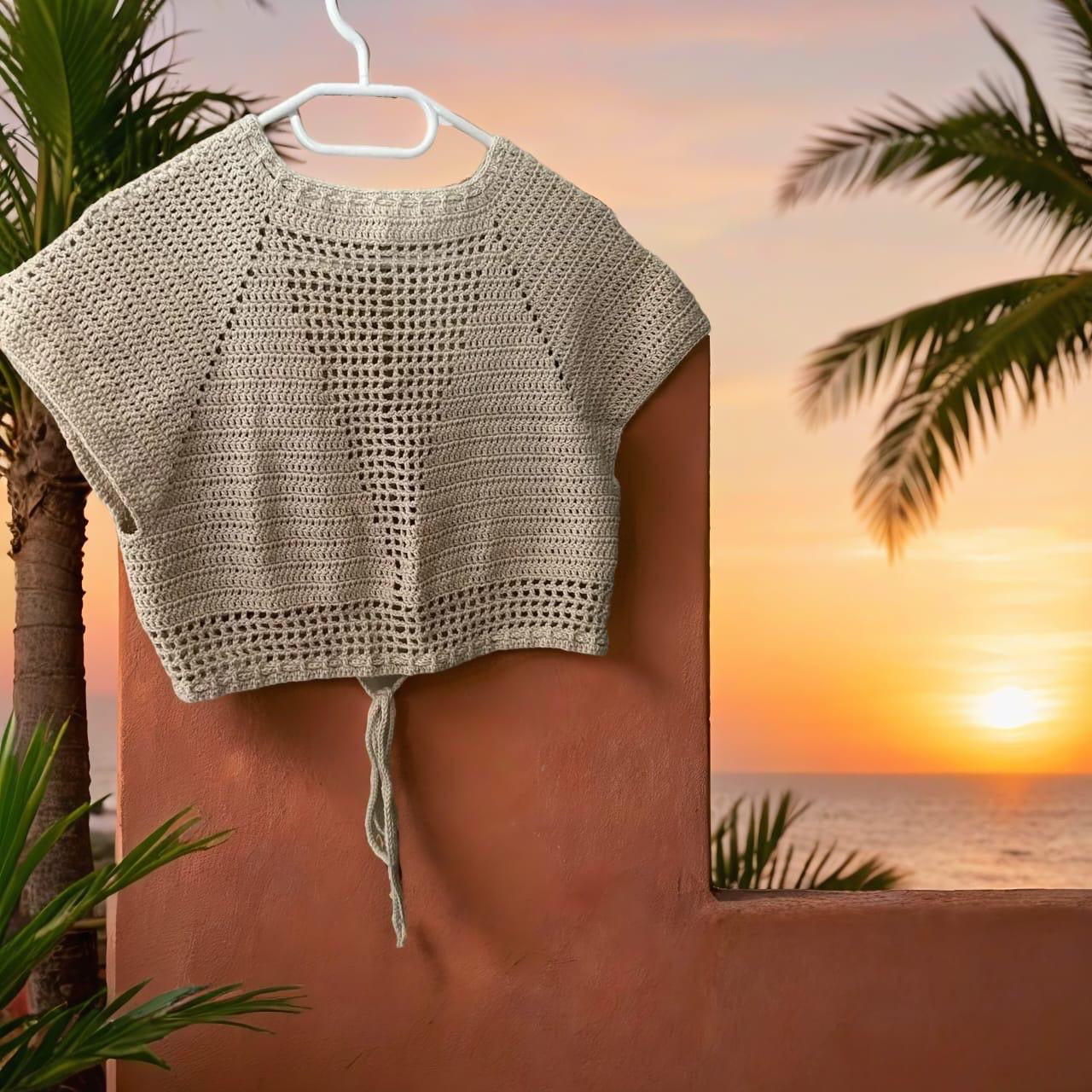 Ein handgehäkeltes Top aus 100 % Baumwolle mit offener Rückenpartie und dekorativen Schnürungen für einen femininen Look. Leicht und angenehm zu tragen, perfekt für warme Tage. Jedes Stück ist handgefertigt und damit ein einzigartiges Accessoire, das jedem Outfit eine besondere Note verleiht.