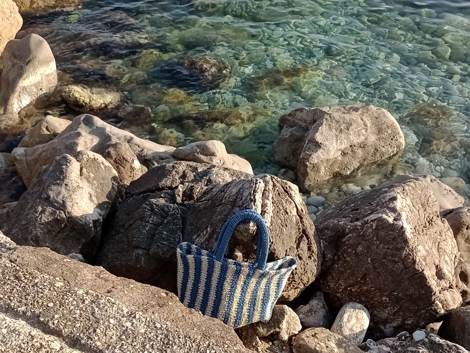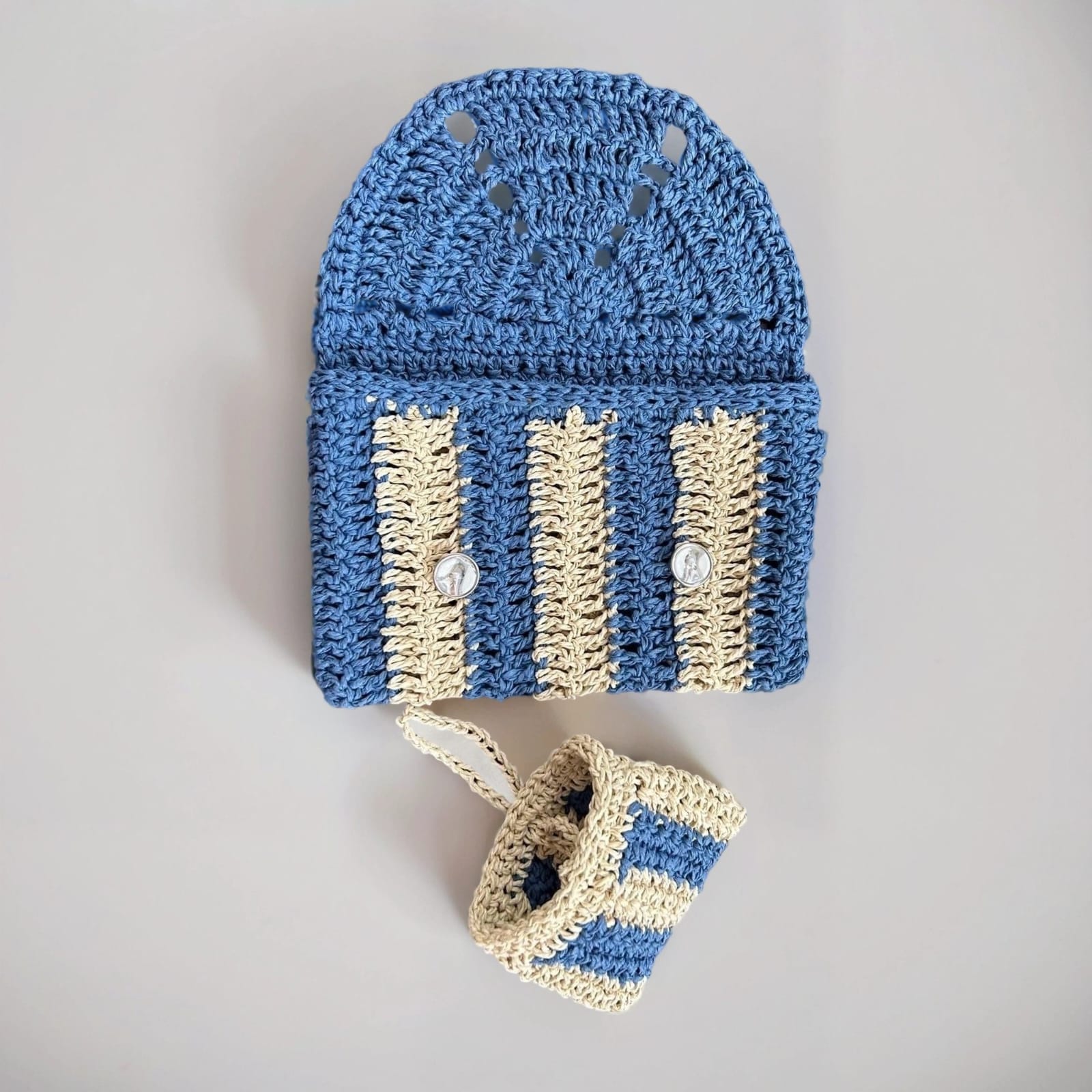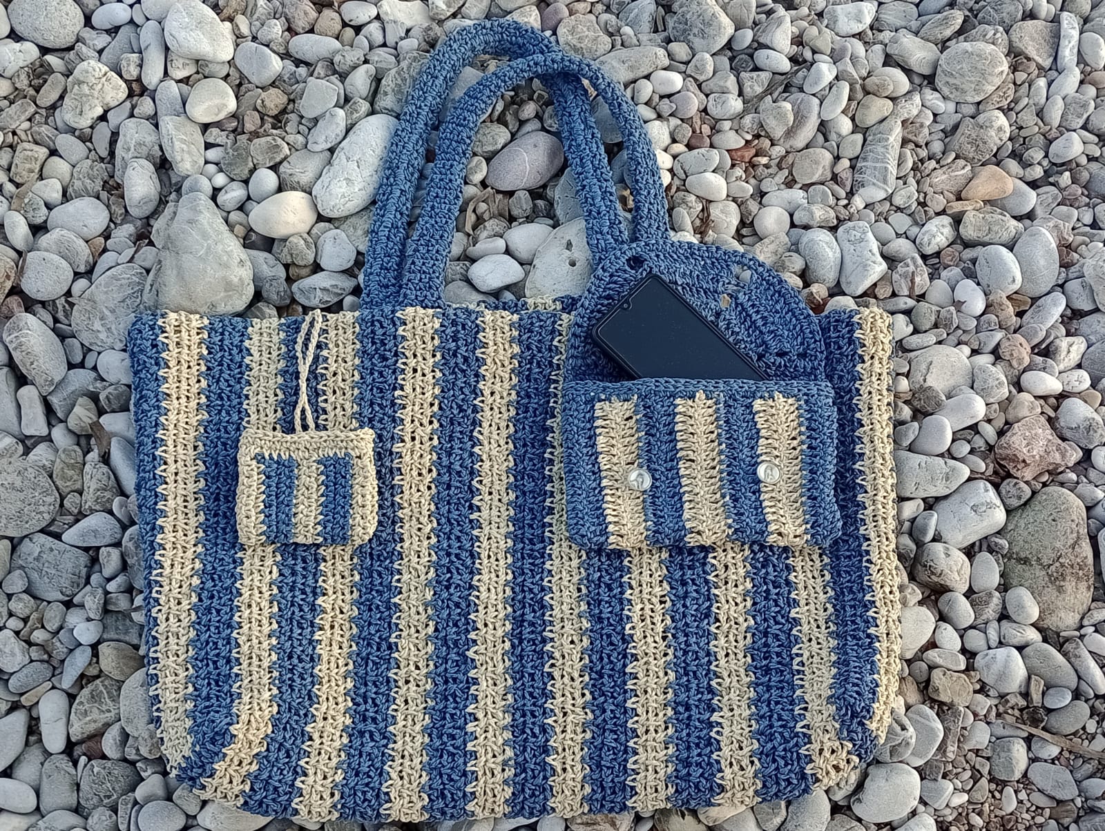 Stilvolle Shopper-Tasche aus natürlicher Raffia mit modernem, zeitlosem Design. Die sanften beige-blauen Streifen sorgen für einen frischen, ruhigen Look, während die Henkel in mittlerer Länge ein bequemes Tragen über der Schulter ermöglichen. Innen befinden sich ein praktisches Täschchen für Smartphone und Brille mit Knopfverschluss sowie ein separates Etui für Kopfhörer oder Schlüssel. Die Tasche ist leicht, geräumig und ideal für Alltag, Shopping oder Urlaub – ein harmonischer Akzent für natürliche und stilbewusste Looks.