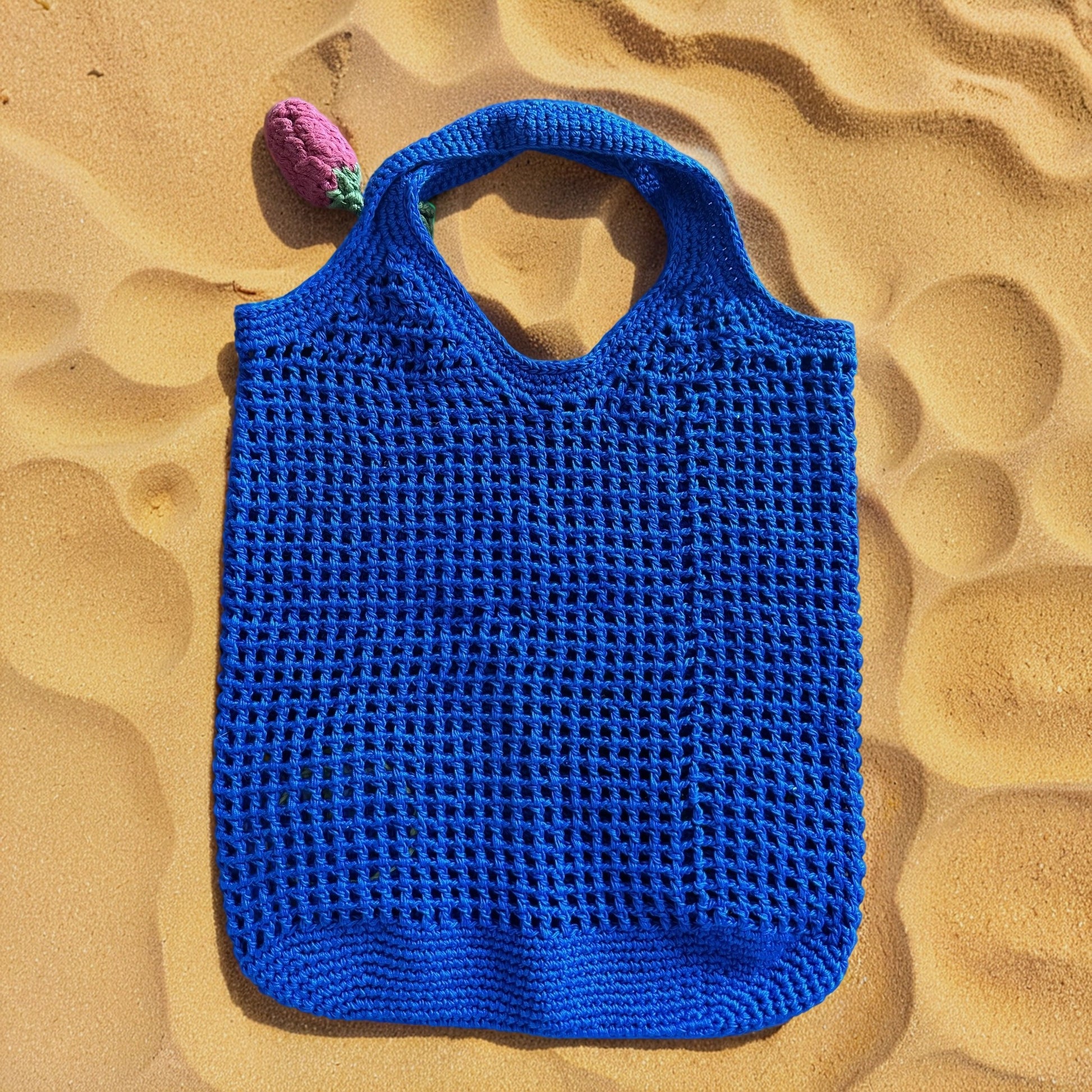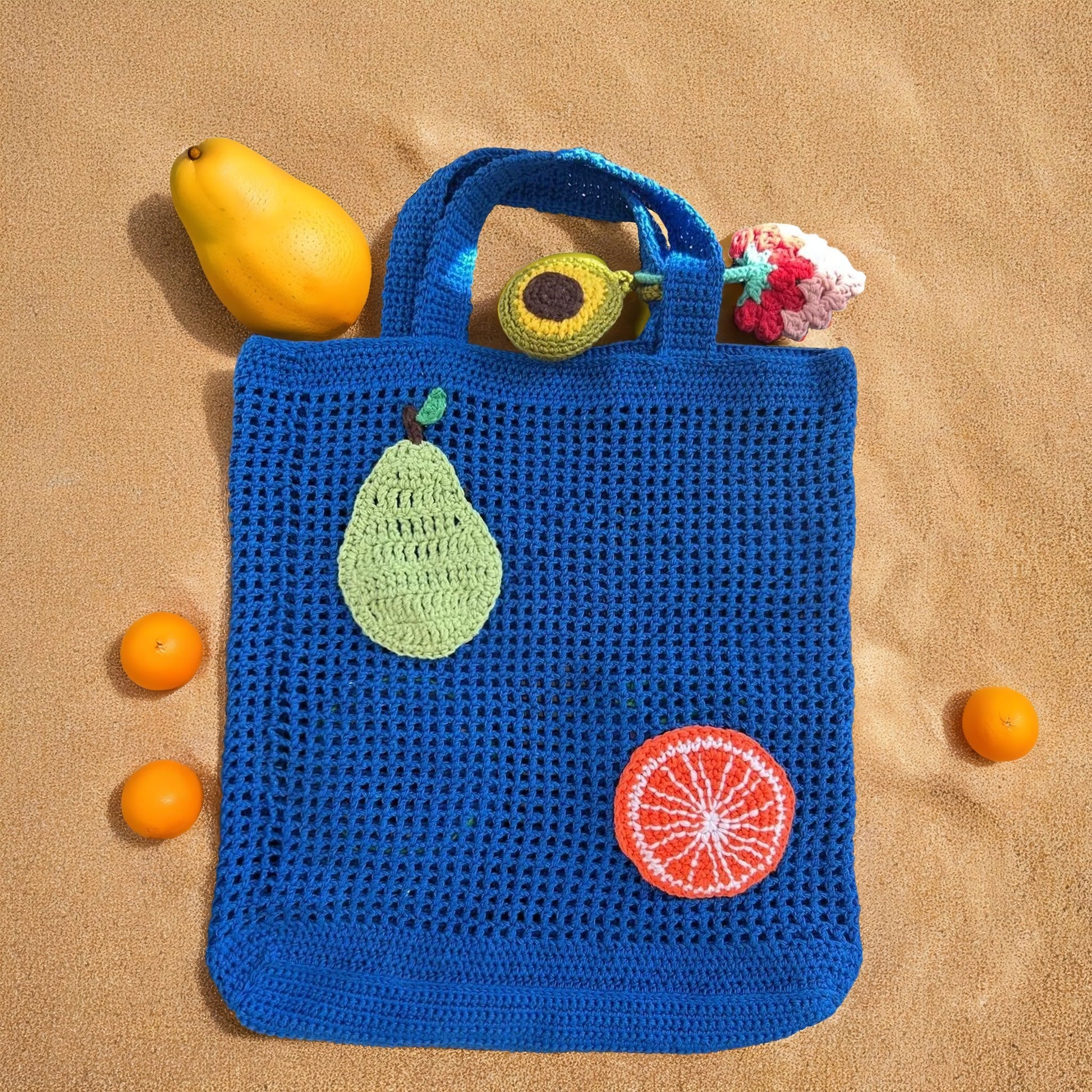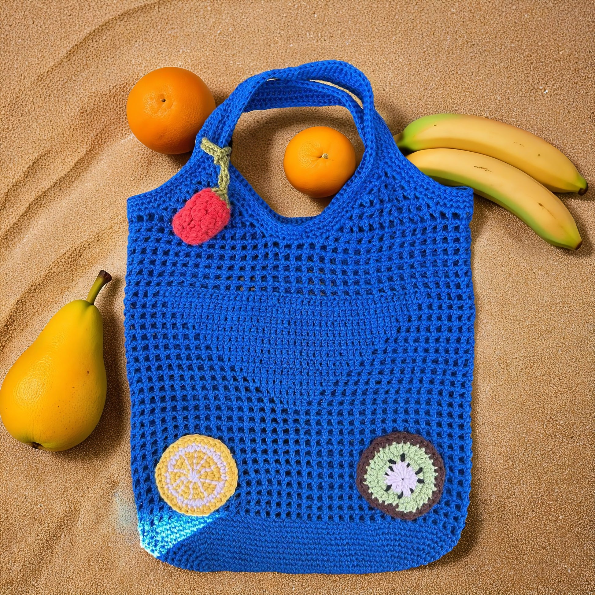 Летняя вязаная крючком сумка-шоппер "Fruit Play" ярко-синего цвета поднимет вам настроение и добавит свежести в ваш образ. Украшенная весёлым фруктовым узором, она идеально подходит для походов на рынок или на пляж. Каждая сумка изготовлена вручную, а небольшие изменения придают ей неповторимый шарм. Лёгкая и вместительная, эта сумка-шоппер станет вашим надёжным спутником в тёплое время года. Погрузитесь в летнее настроение с этой весёлой и стильной сумкой!